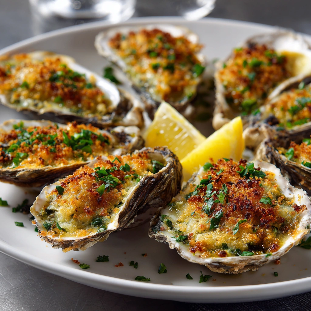 Once done, remove the tray carefully. Let the oysters rest for a minute before transferring to a serving platter. Garnish with extra chopped parsley if desired and arrange lemon wedges around the platter for squeezing over the oysters just before eating. Serve immediately while still hot and aromatic, allowing the contrast of crisp topping and briny oyster to shine.