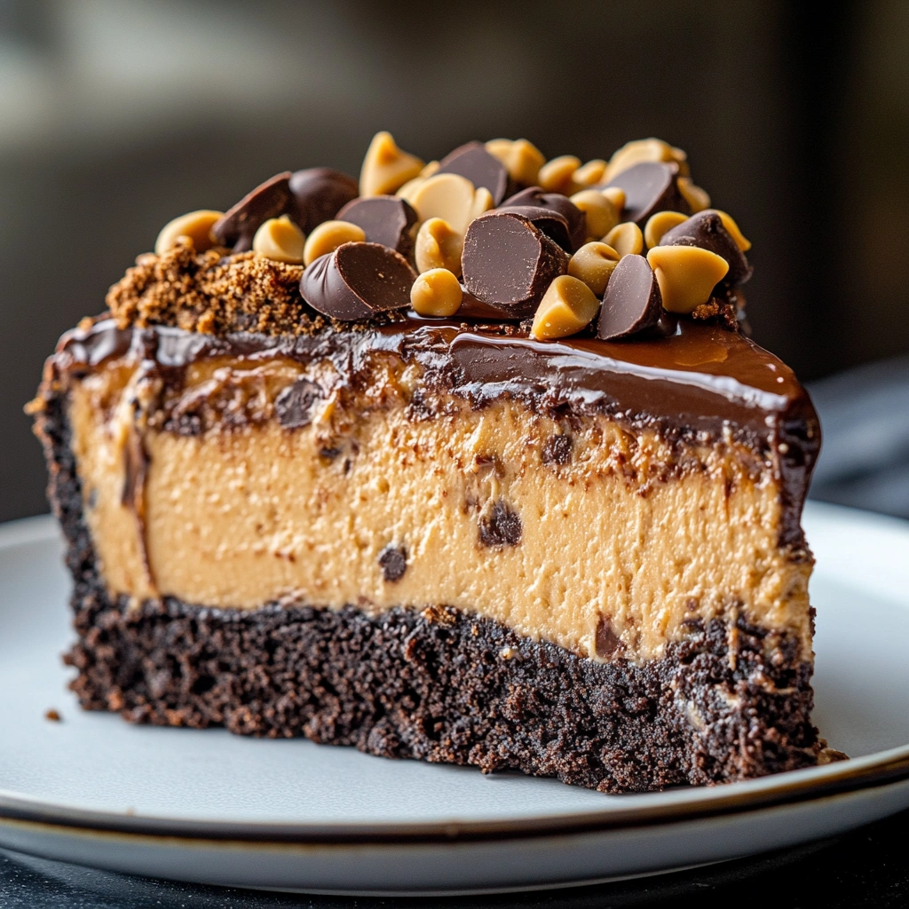 Gently release the pie from its pan by running a thin, warm knife around the edge before lifting the removable bottom or unlatching the springform. For clean slices, dip your knife in hot water, wipe it dry, then slice in one fluid motion. Arrange each wedge on chilled plates to keep the ganache firm. Garnish with a dollop of softly piped whipped cream rosettes, a light dusting of cocoa powder, or a sprinkling of chopped roasted peanuts for contrast. For a refined touch, serve alongside fresh raspberries or a drizzle of salted caramel on the plate. If making for a crowd, display the whole pie on a cake stand and provide a cake server so guests can help themselves. To emphasize its layers, consider plating against a dark background—this visually highlights the pale peanut butter filling capped by the glossy chocolate top.