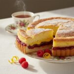 A beautiful Derbyshire pudding with raspberry jam, tangy lemon curd, and a golden lemon sponge topping in crisp sweet shortcrust pastry. Inspired by Peak District baking traditions. Serves 8.