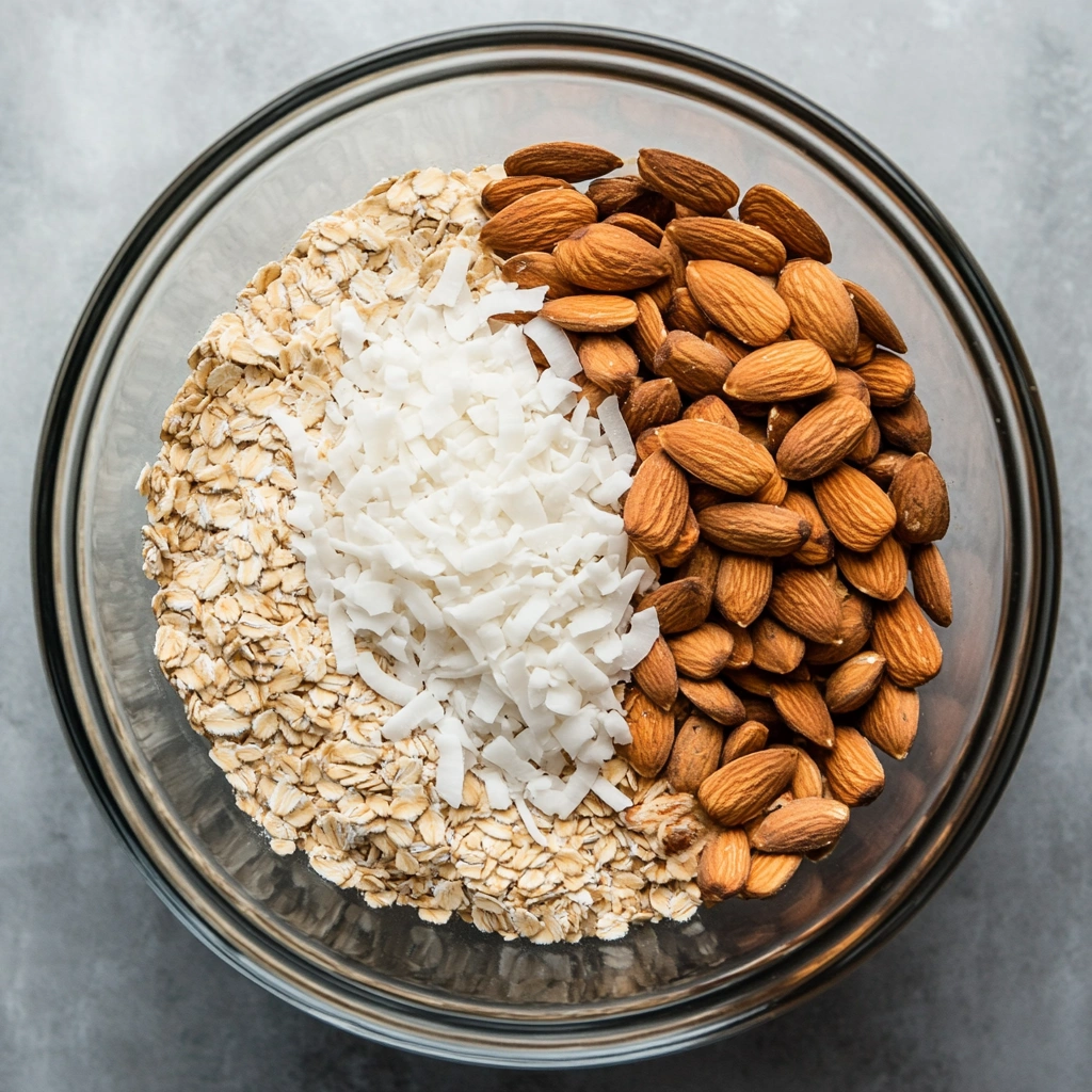 In a large mixing bowl, combine the rolled oats, sliced almonds, shredded coconut, cinnamon, and salt. Give everything a good stir to make sure each ingredient is evenly distributed. This dry mix is the foundation of your granola, so you want it well-combined before adding the wet ingredients.