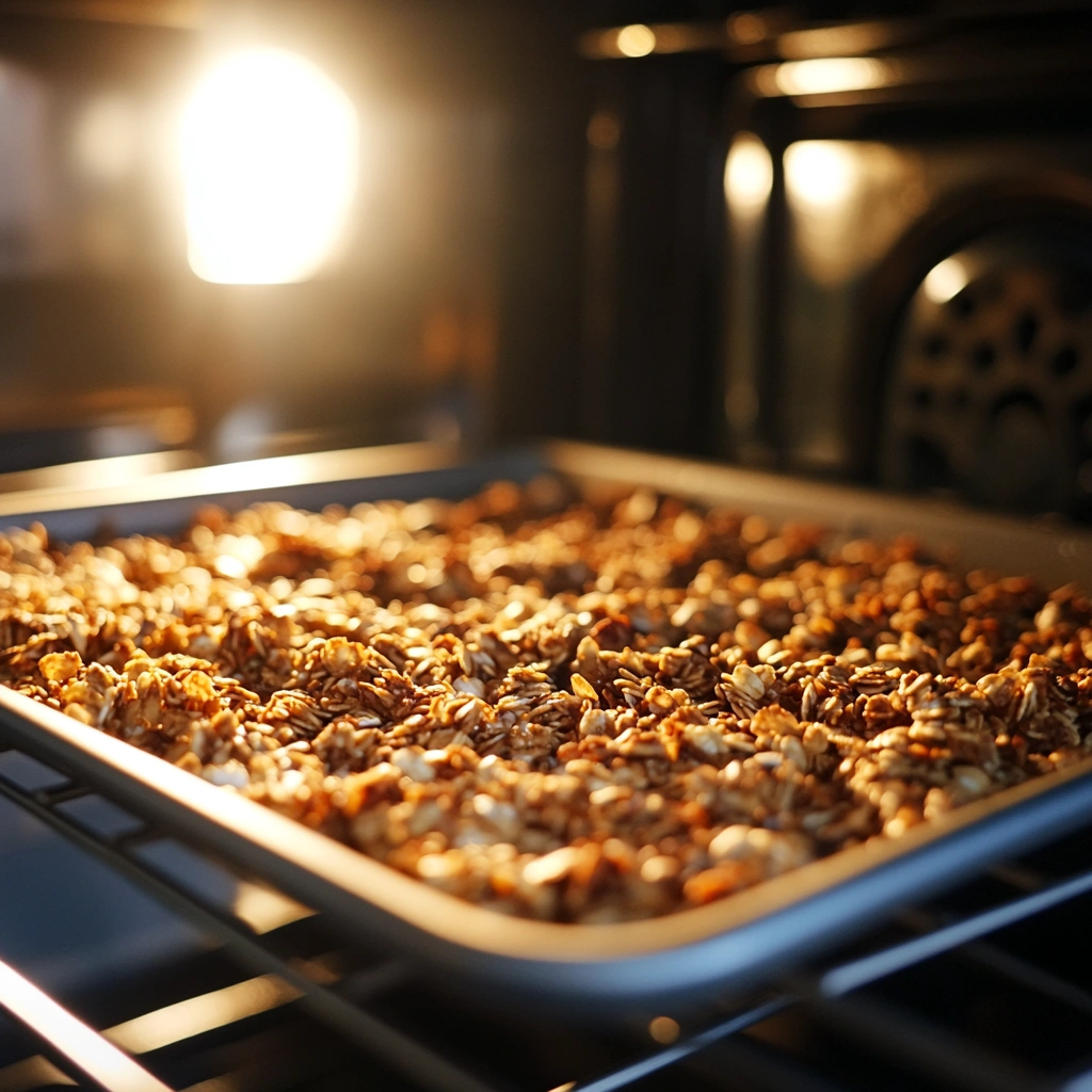 Now that your granola mixture is ready, it’s time to turn it into golden-brown perfection. This step brings all the flavors together, creating that irresistible crunch and warm aroma that makes homemade granola so special.