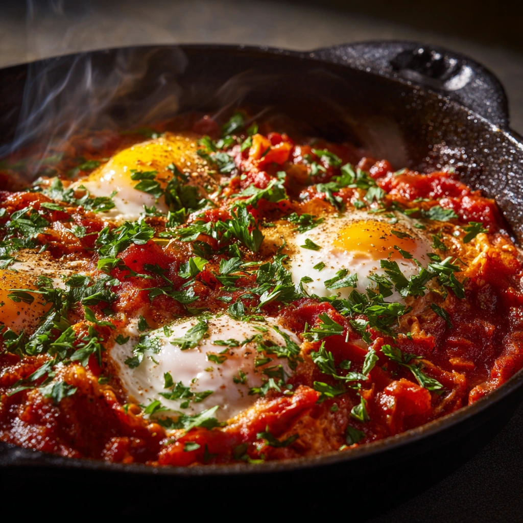 Eggs in the sauce: Create small wells in the simmering sauce and crack eggs into them. Cover and cook for 5–7 minutes until just set.