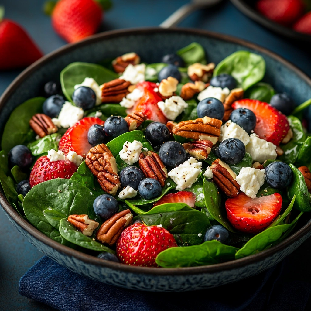 More than just delicious, it’s packed with nutrients. Spinach provides a rich base of iron and fiber, while strawberries and blueberries bring antioxidants and vitamin C. Pecans contribute healthy fats and satisfying crunch, and feta rounds it out with a salty, creamy punch. This salad is colorful, nourishing, and endlessly adaptable, making it a go-to option for warm weather meals or when you simply crave something fresh and wholesome.